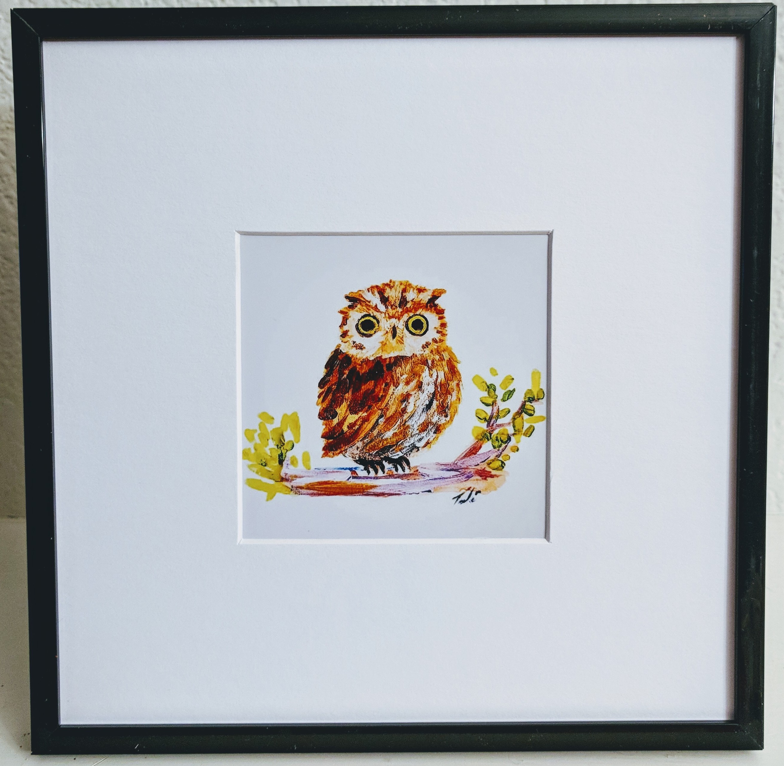 Painting Nº.3 – The Scruffy Owl Black 8″x8″ plastic frame, with white top mat, and signed original 4″x4″ print.