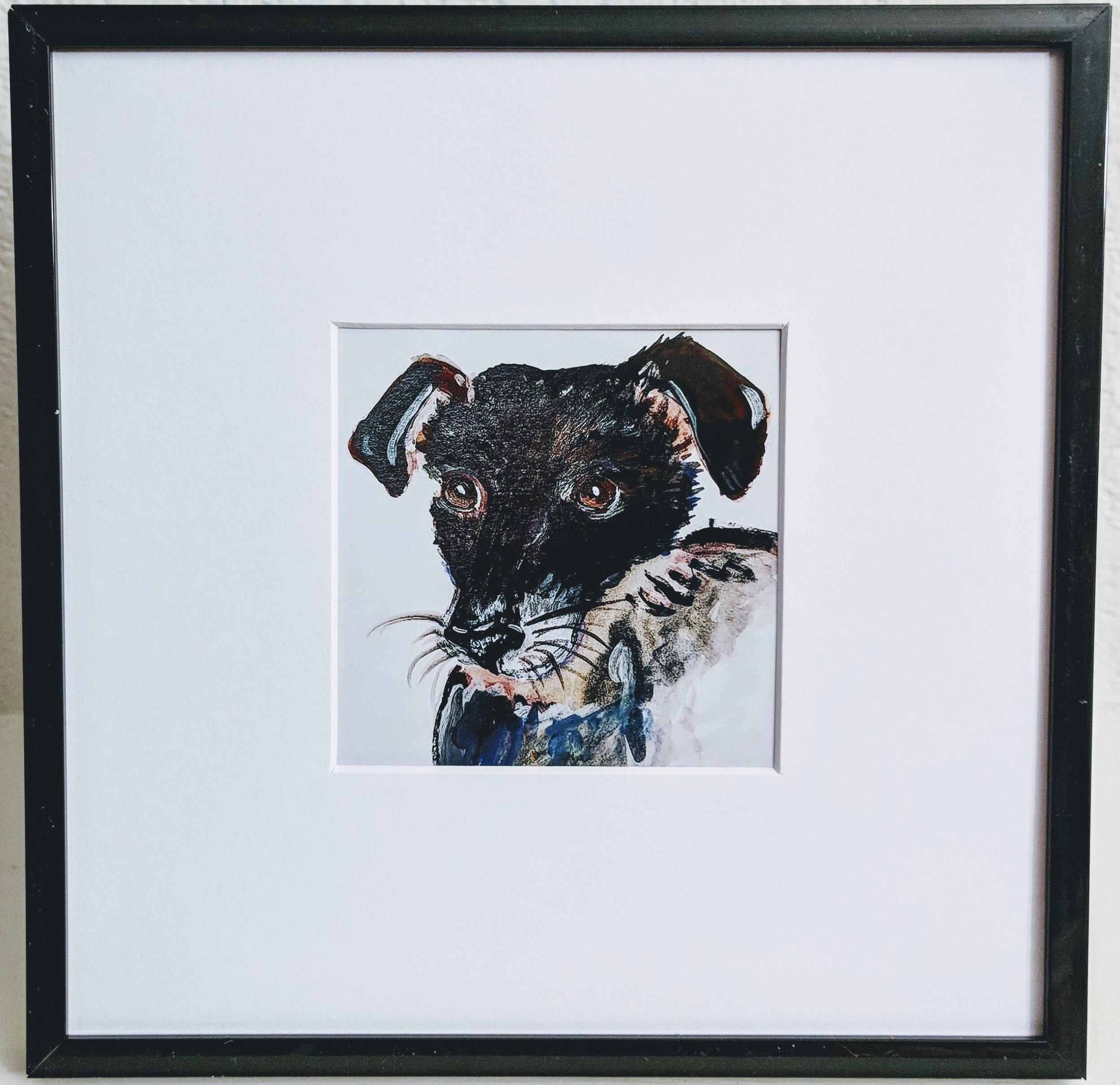 Painting Nº.5: The Timid Pup The black plastic frame size is 8″x8″ with a white top mat over a 4″x4″ original signed print.